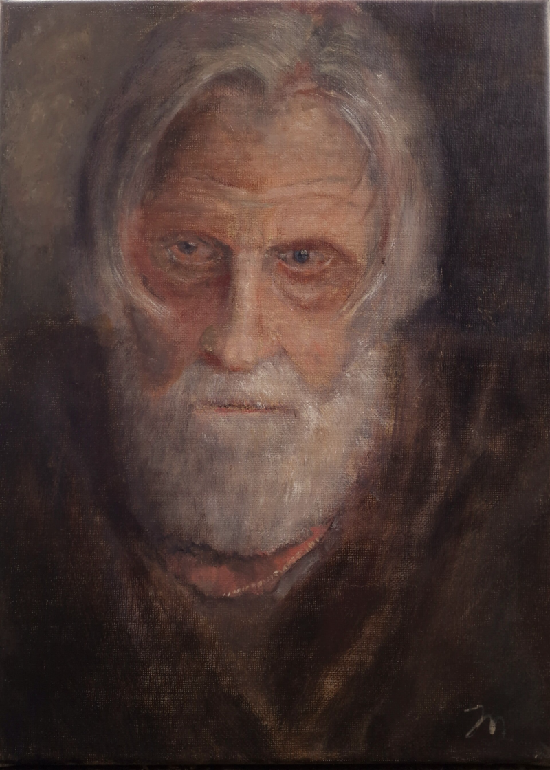 I mine portrettmalerier prøver jeg å fange uttrykk og stemninger. Her maleriet "Fra sinne og tvil til apati" Bildet illustrerer en mann som etter lang tids sinne og tvil er på vei inn i motløshet og apati. Den ene siden av ansiktet uttrykker sinne og tvil mens den andre utrykker apati. Bildet ble malt i Provence etter en modell fra Ålesund som heter Egil